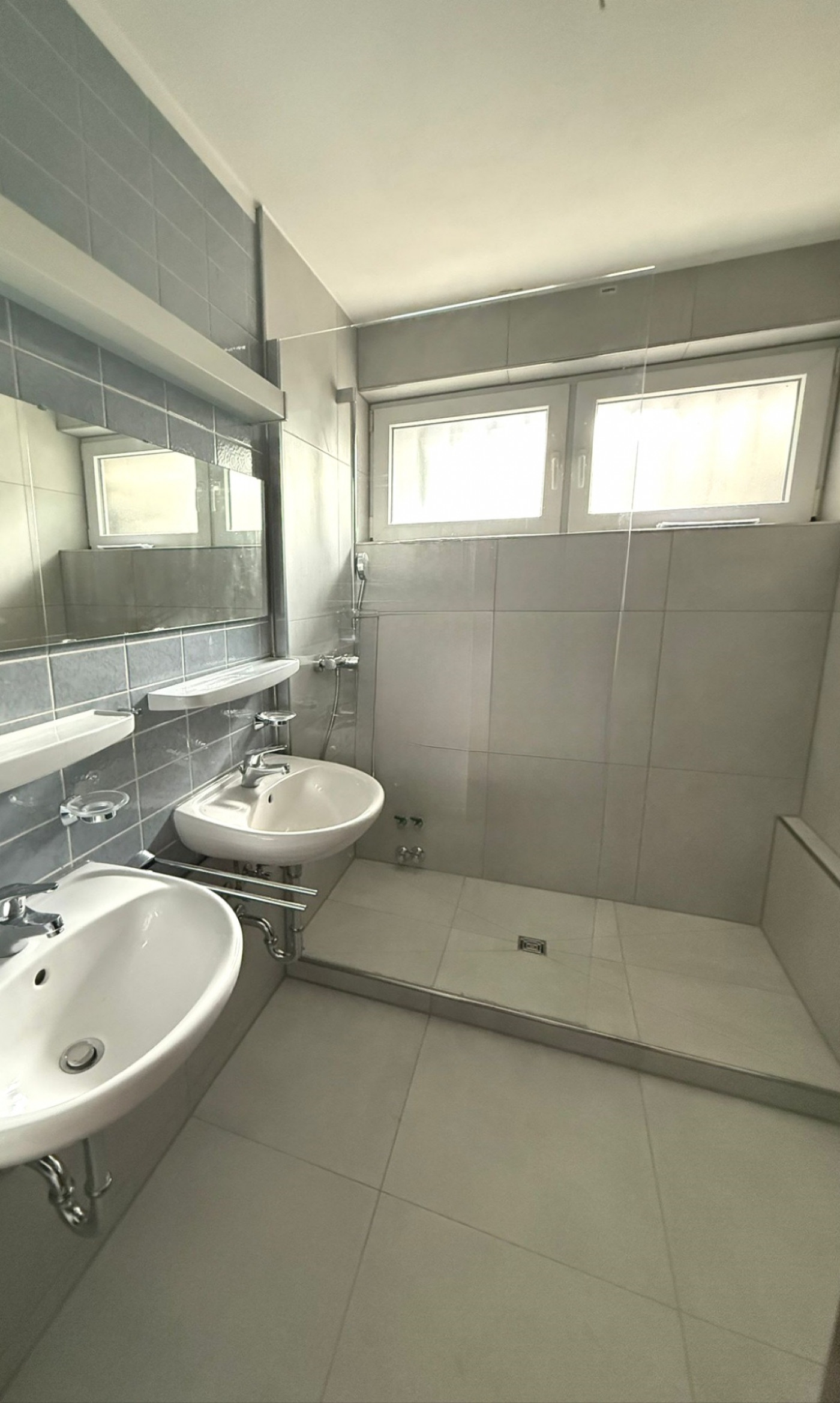 – Badezimmer mit 2 Waschbecken sowie eine ebenerdige Dusche mit Glasabtrennung